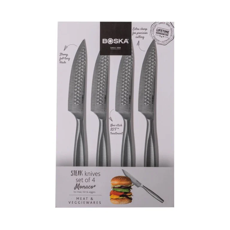 Řezejte jako profík se steakovými noži Monaco+. Tato sada čtyř steakových nožů z nerezové oceli kombinuje funkčnost se stylovým designem a posouvá váš zážitek ze stolování na vyšší úroveň. Vhodné pro krájení masa, ryb a zeleniny, jak u jídelního stolu, tak v kuchyni.