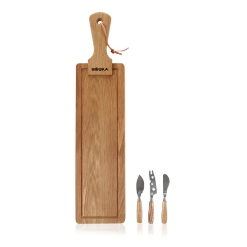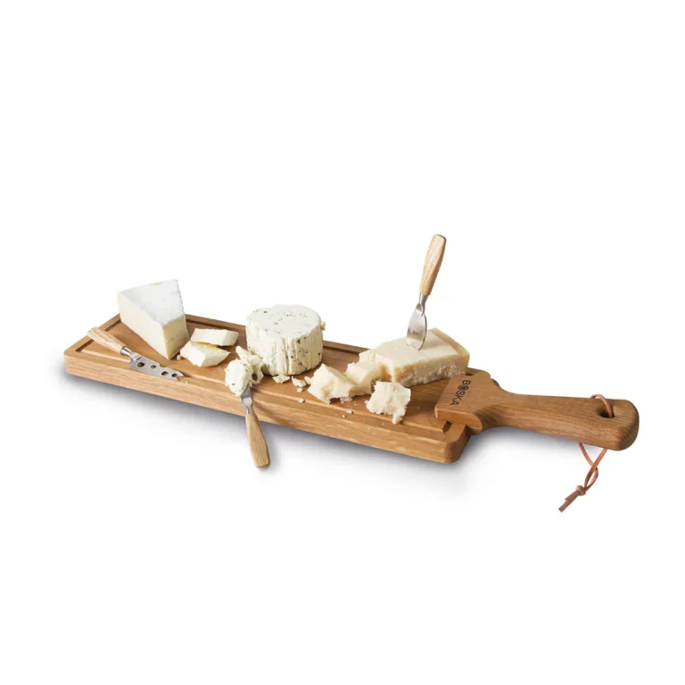 Se sýrovou sadou Friends máte vše po ruce, abyste mohli podávat lahodné sýrové prkénko. Dubové prkno nabízí dostatek místa pro několik druhů sýrů a tapas. S nerezovými čepelemi můžete nasekat jakýkoli druh sýra.