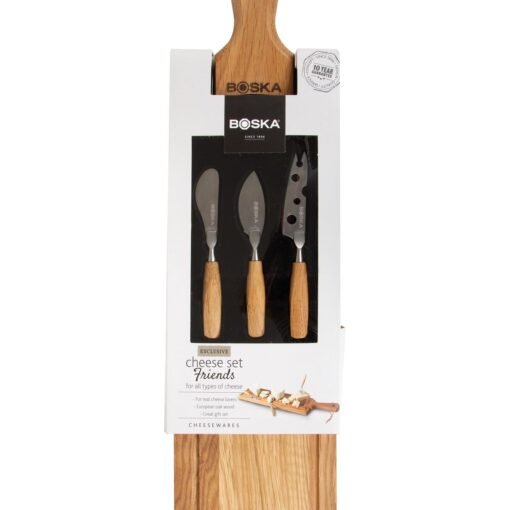Při správné péči vám tato sýrová sada vydrží roky. Jak toho dosáhnete? Je to jednoduché! Před prvním použitím namočte sýrovou desku na 3 noci BOSKA Board Oil. Desku pak stačí měsíčně nastříkat a důkladně přetřít. Chráníte tak prkno před rozštípnutím a pohlcováním pachů a skvrn. Prkénko a nože na sýr omyjte ručně a nechte prkénko ve svislé poloze oschnout. Tímto způsobem můžete s touto sýrovou sadou Friends podávat ta nejchutnější sýrová prkénka po mnoho let.